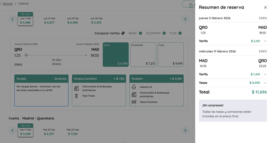 En una consulta rápida por parte de Alternatrip, encontramos que en la página de Iberojet los precios para un vuelo redondo Querétaro – Madrid, en tarifa básica para el mes de febrero 2026 rondan los $11,700 en comparación con los $14,000 o $15,000 que se ofertan en vuelos desde el AICM de la CDMX.